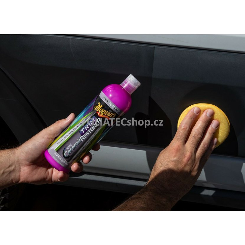 Pokud šedé a černé plasty a gumové části v exteriéru Vašeho vozu ztrácí svůj perfektní vzhled, Meguiar's Hybrid Ceramic Trim Restorer je dokáže oživit, dodá jim hluboký tmavý lesk a navrch dodá povrchu keramickou ochranu, která dosažené výsledky uzamkne na dlouhou dobu. A to i když auto myjete, nebo na něj prší.